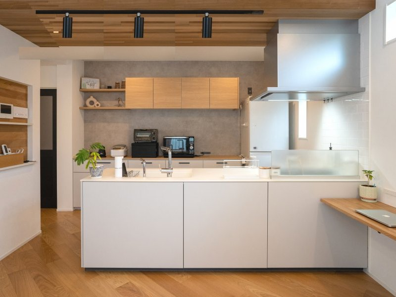 奥様のこだわりが詰まったLDKは、室内も外観とのつながりを意識し、清潔感のある白を基調にしています。注目すべきは、効果的な木目の使い方。斜め張りの床やキッチンの下がり天井、造作棚など、木の質感や色合いの違いを生かした動きのある空間に仕上がっています。